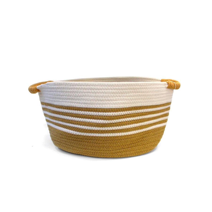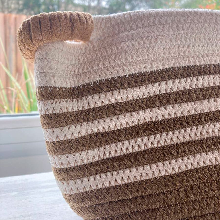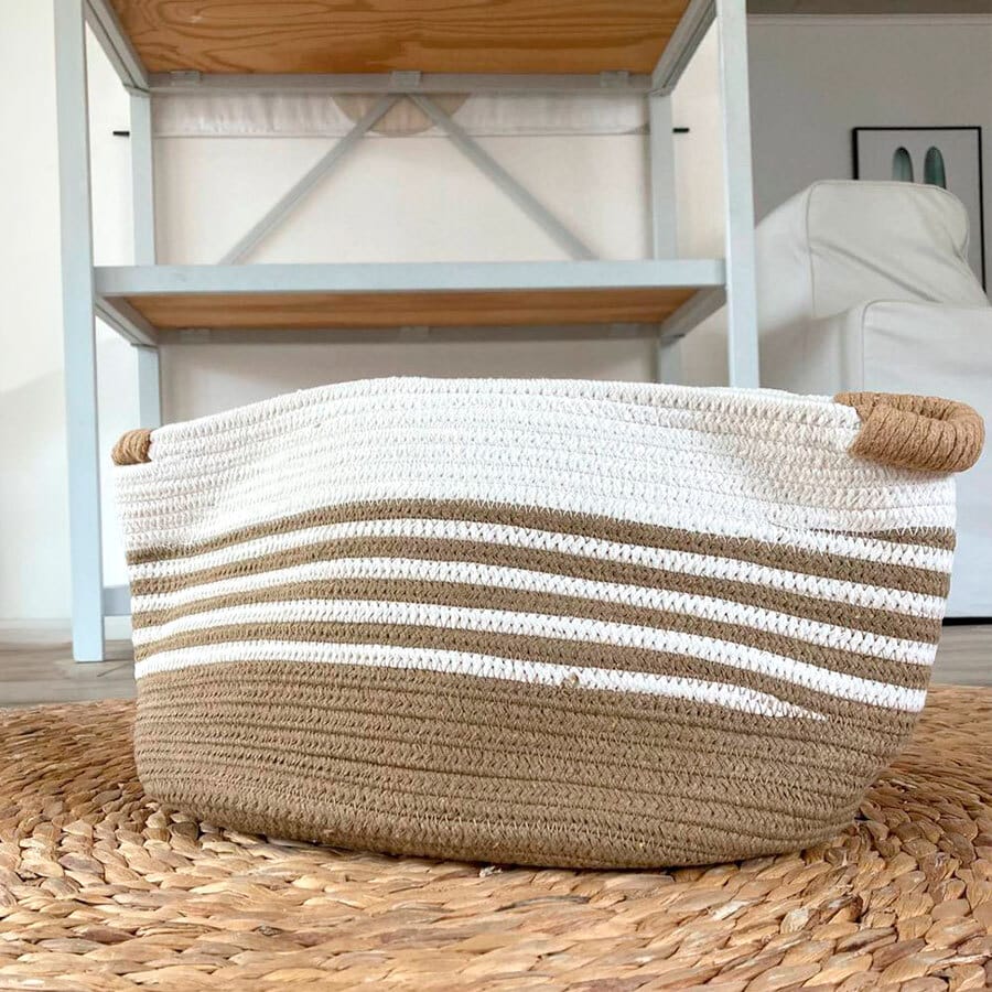Con un diseño en colores sutiles, esta cesta no solo es práctica sino también estéticamente agradable, agregando un toque elegante a la decoración del hogar.