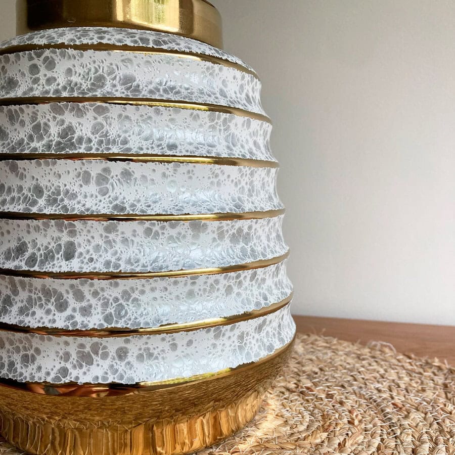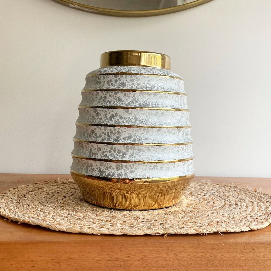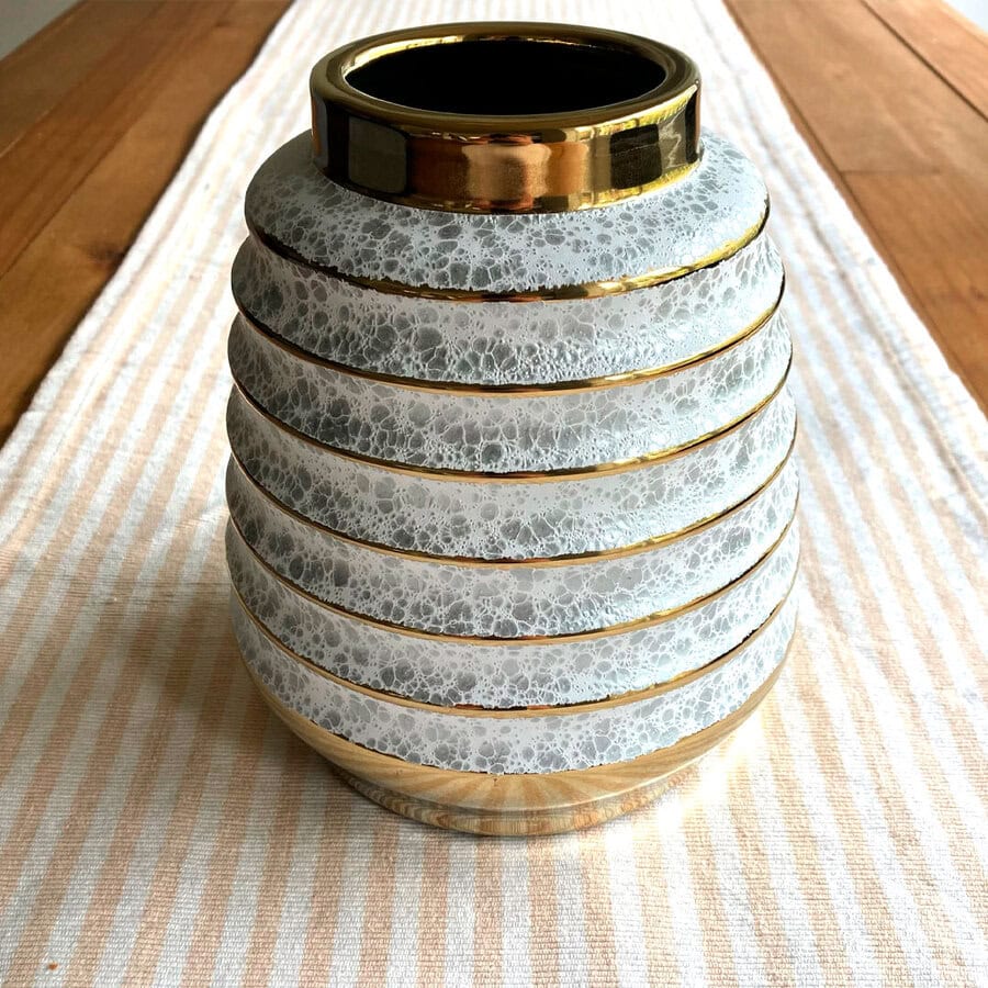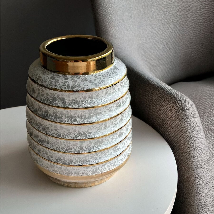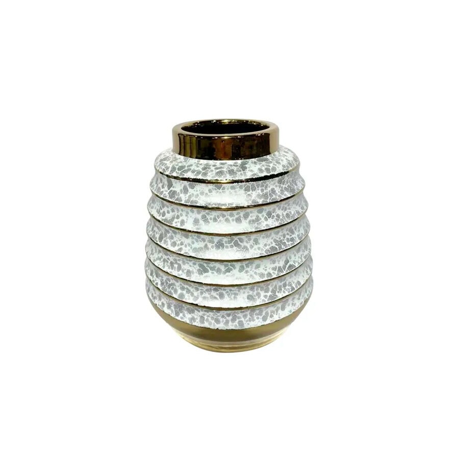 Florero Arcilla Blanco con Dorado 17 x 17 x 20 cm.