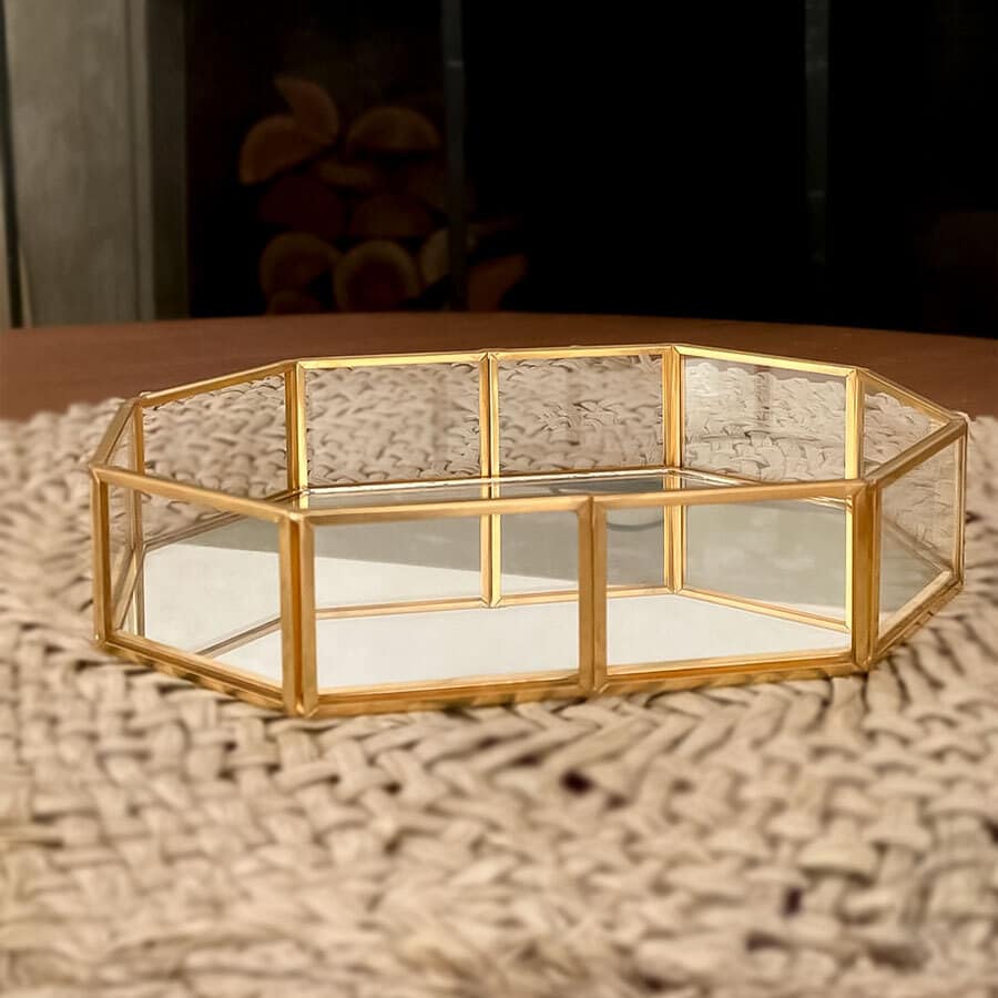 La Bandeja Espejada geométrica no solo es un accesorio funcional, sino también una elegante adición a tu decoración. Confeccionada con vidrio y hierro de alta calidad, esta bandeja combina durabilidad y estilo en un diseño geométrico único. Con medidas de 14x20x4 cm, resulta perfecta para resaltar estanterías, mesas o cómodas con su presencia elegante.