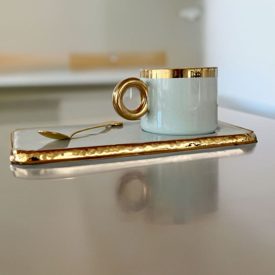 La taza mide 8cm diámetro y 6.5 cm alto y su plato 22,9 de largo x 11,6 de ancho